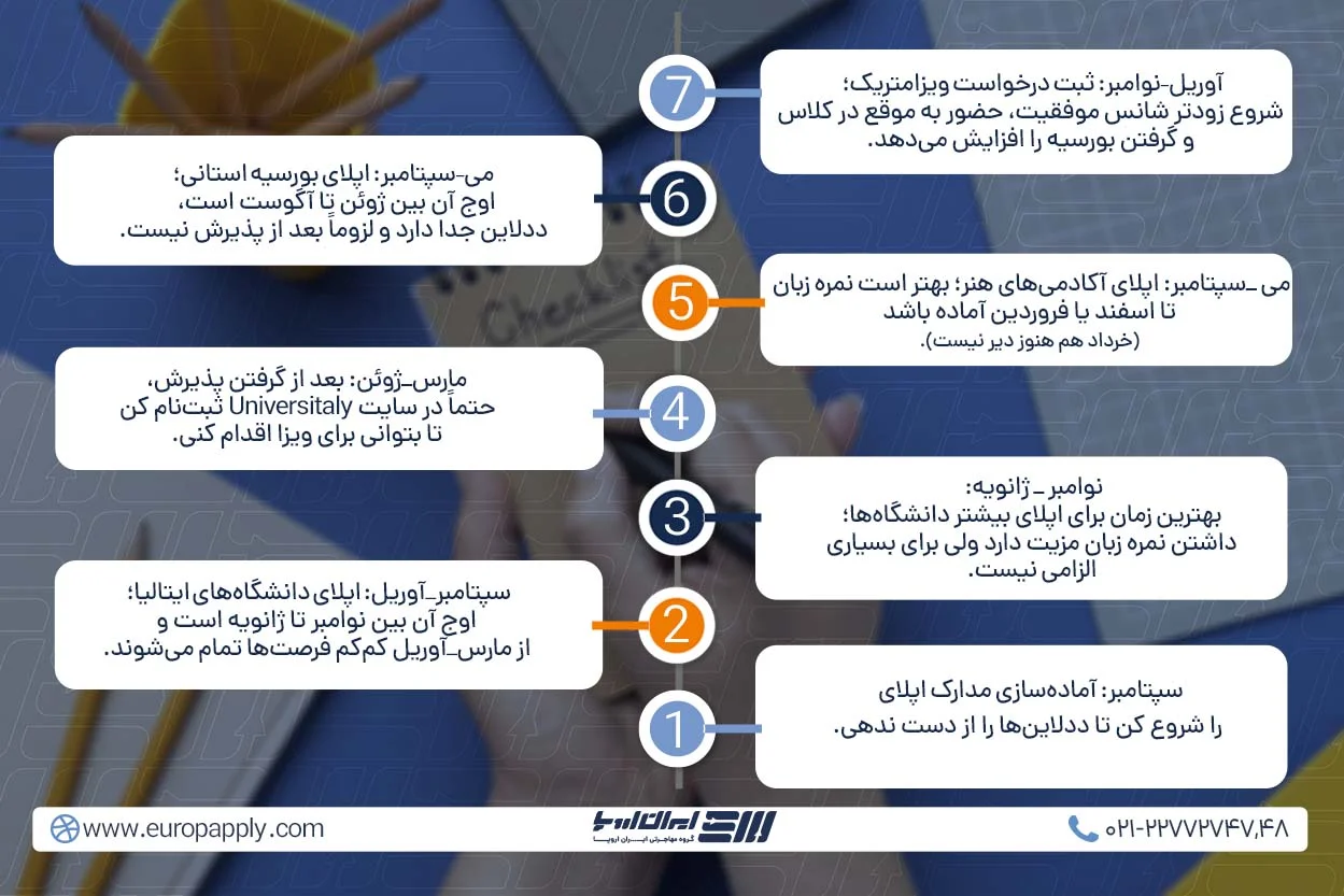 بهطور معمول، اوج زمان اپلای در دانشگاههای ایتالیا بین نوامبر تا ژانویه است. در این بازه زمانی تقریباً همه دانشگاهها فراخوان پذیرش خود را منتشر کرده و امکان ارسال درخواست را فراهم میکنند.